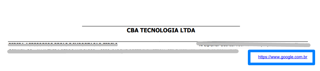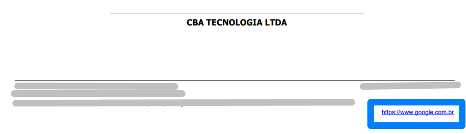 O parâmetro P1423 permite a inclusão de um link personalizado no canto inferior direito da impressão de Orçamento e Pedido de Compra.