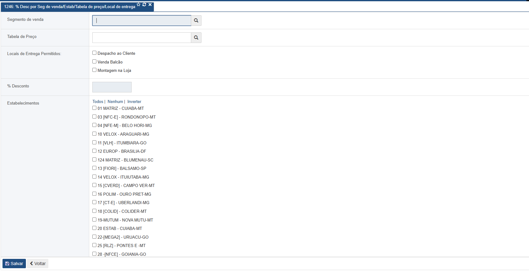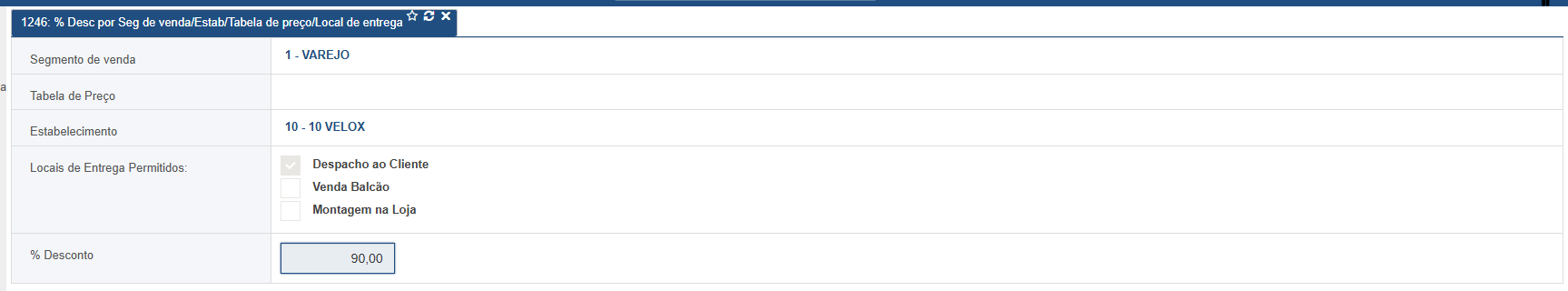 A rotina R1246 permite cadastrar o percentual de desconto por segmento de venda/estabelecimento/tabela de preço e local de entrega. Para realizar o cadastro é necessário informar o segmento de venda, ao menos um estabelecimento, tabela de preço, local de entrega e o percentual de desconto: