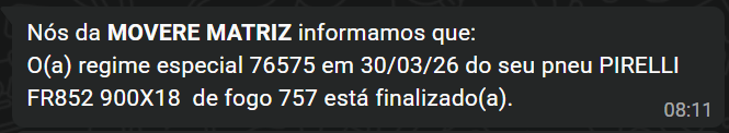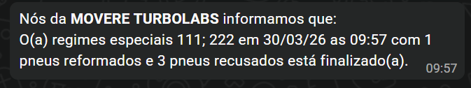 *Nós da Recapadora informamos que: O(a) {regime especial/coleta/orçamento X} em {DD/MM/YY as HH:MM} do seu pneu {MARCA} {MODELO} {MEDIDA} de fogo {NÚMERO DE FOGO} está finalizado(a).