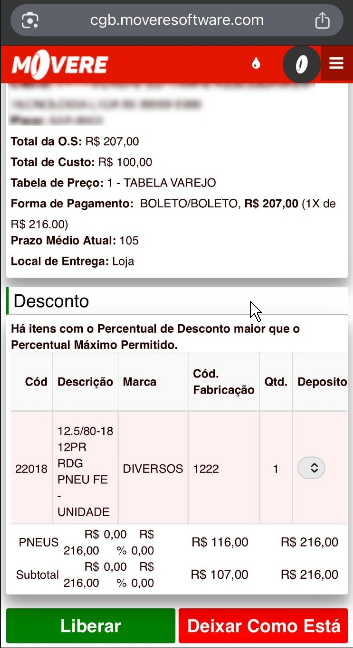 [Liberar], ao clicar neste botão o sistema fará as validações de liberação de seu usuário e liberará a O.S., caso apresente a mensagem abaixo significa que seu usuário não tem liberação suficiente. Logo, deve ser revista na [R1067 – Política de Desconto].