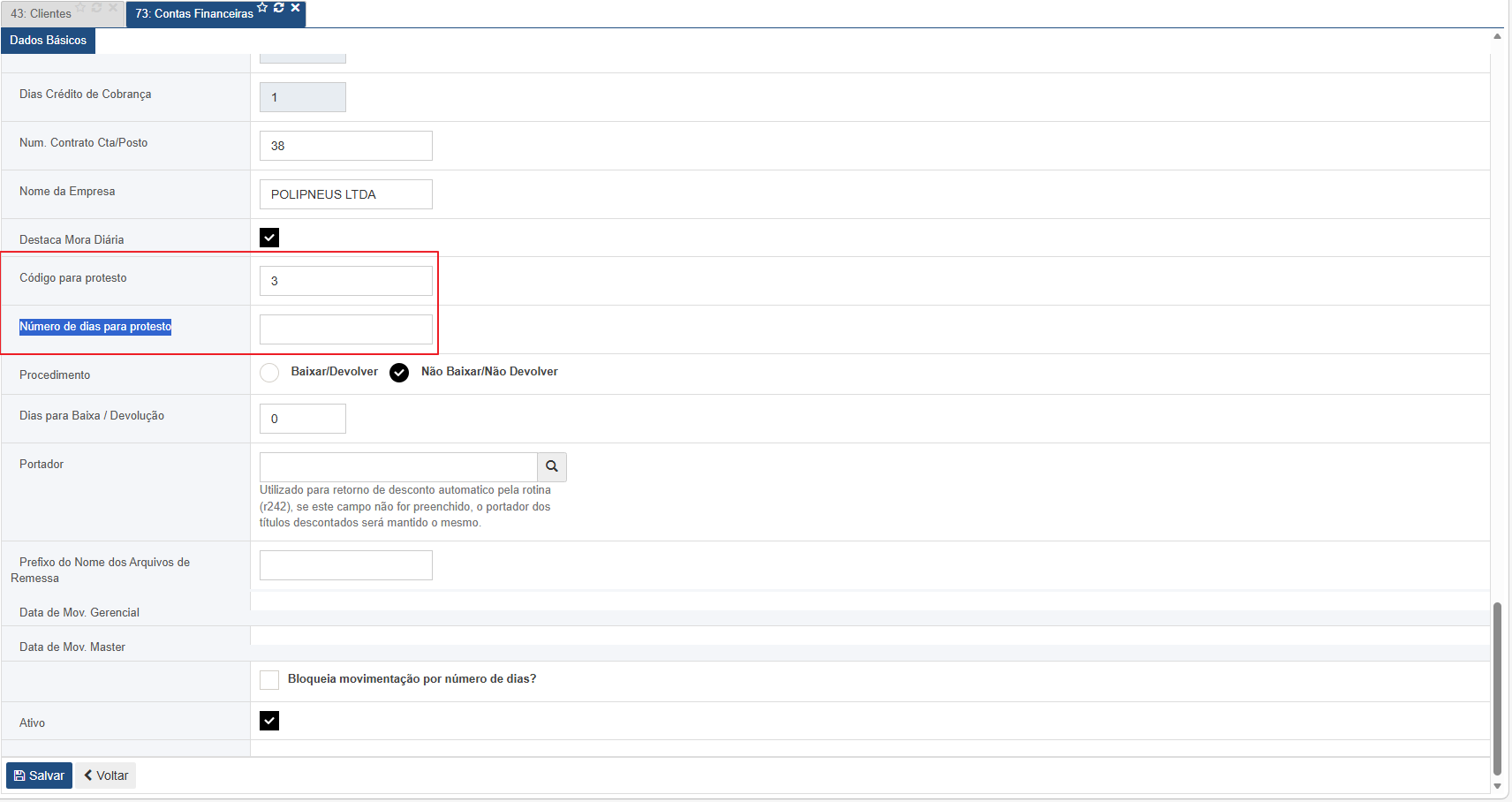 No campo “código para protesto”, configurar conforme o alinhamento realizado com o cliente: